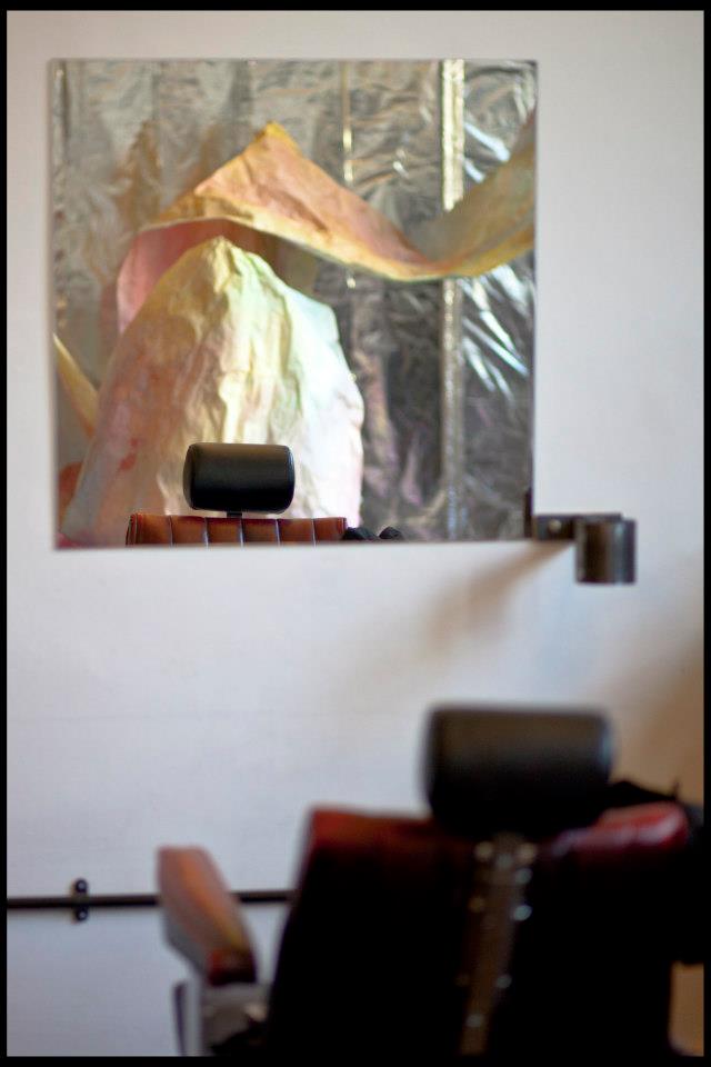 The materials used are intended to contribute to that aim, for example the tinfoil wall; it creates an interaction between the physical work, the unclear reflections of the viewers and the colours reproduced in the metallic material. The viewers are drawn into imagery of shifting visions.
