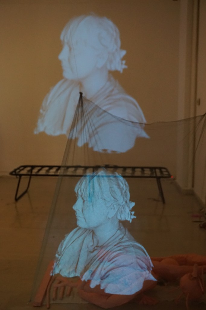 Rachel Parry’s ongoing project ‘Malfunctioning Perfectly’ embraces new technology to explore disability and performance of the rawness of monstrous grotesque reclaimed. It specifically addresses neurodiversity and the artist’s experiences of living with ADHD (Attention Deficit Hyperactivity Disorder), Autism and hidden bodily disabilities. Working with various AI (Artificial intelligence), Parry has been collaborating with the bots to teach them how to see art, the artist’s body, and how to interpret performance of liveness. Resulting in a range of media, sculptures, video art, and performance. Ongoing research is funded by the Arts Council England.