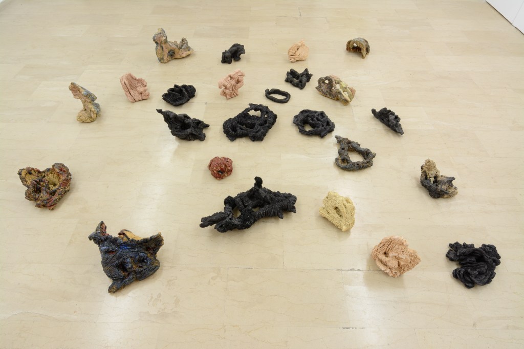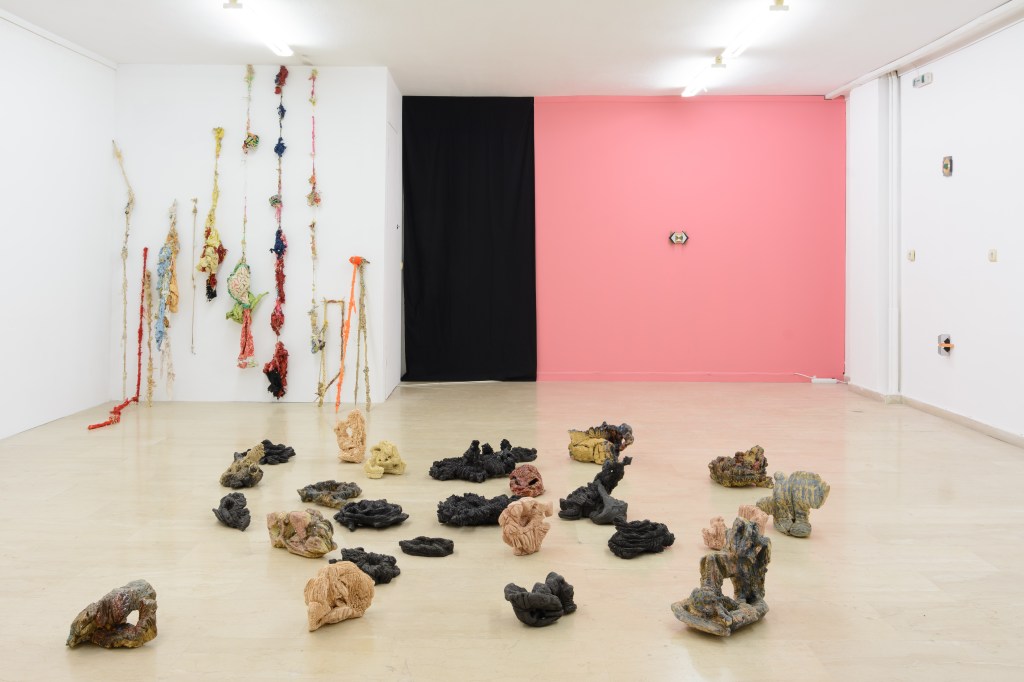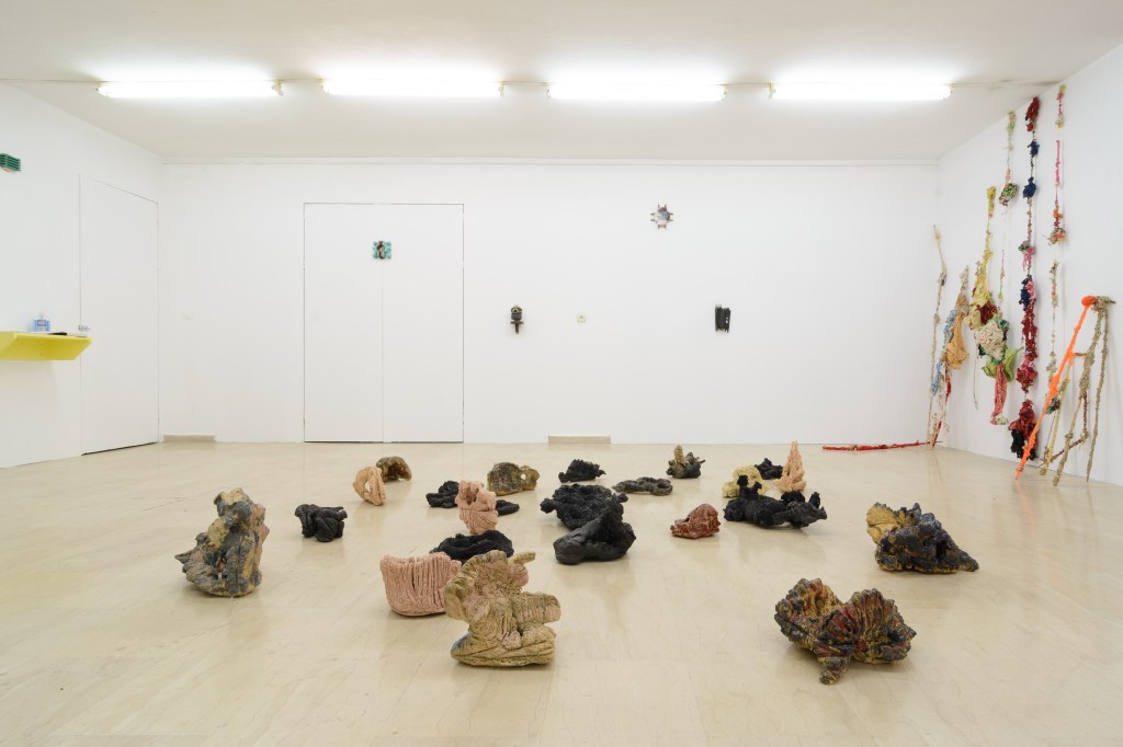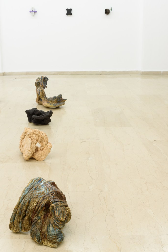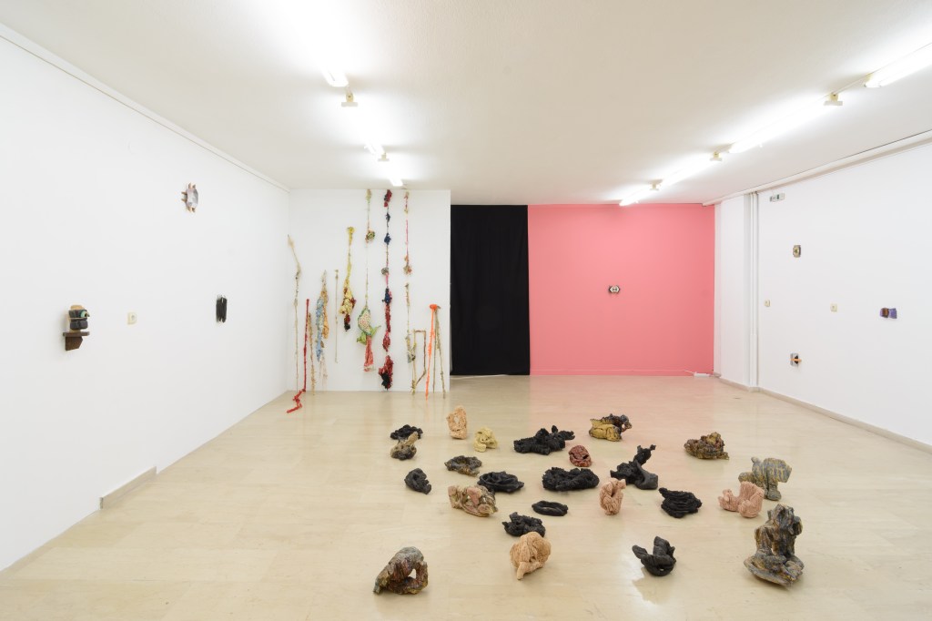 Ameladiotis presents two installations for this exhibition. ‘A primary design study on incomplete stones’ explores his preoccupation with the art of ceramics, which concisely embodies the concept of the organic and gradual process of material manipulation without anticipating the artworks evolution and the final form. Archetypically, the raw material of ceramics originates from sand, which according to beliefs, is the main component of life. In dialogue with this cluster of ceramics is a series of sticks and knots, ‘Blinds of confession’. This piece is the result of endless, stereotypical and obsessive acts which develop imperfectly via touch postponing their completion in uncertain time and length. The term “blinds’ in the title refers to the thin shutters of the narrow confessional rooms in the Catholic Church, as the process of knots takes in account the units of measurement of prayer and repentance in the Orthodox Church.