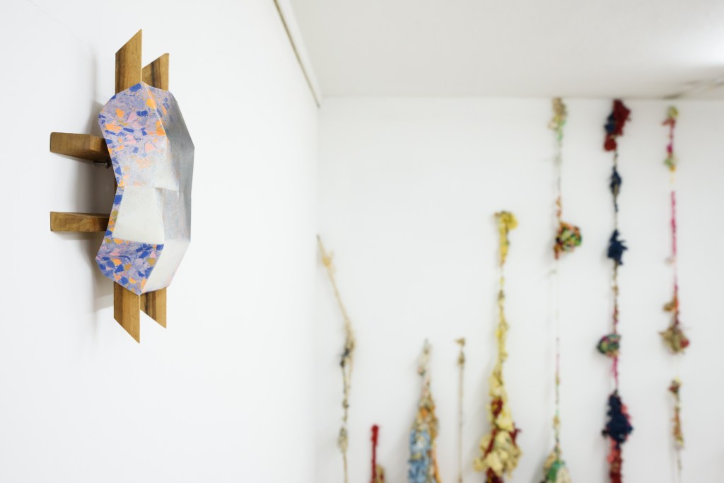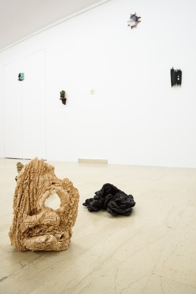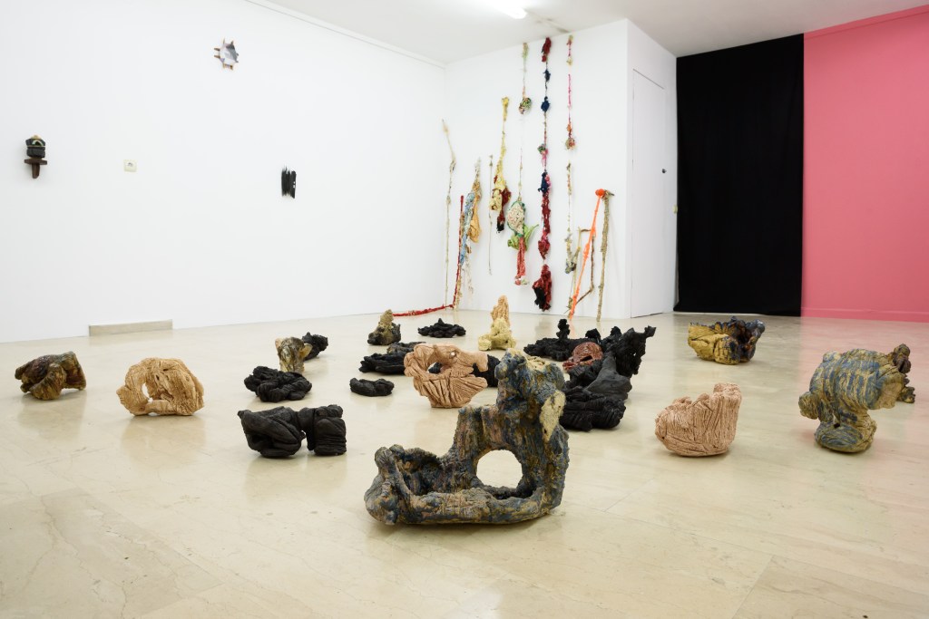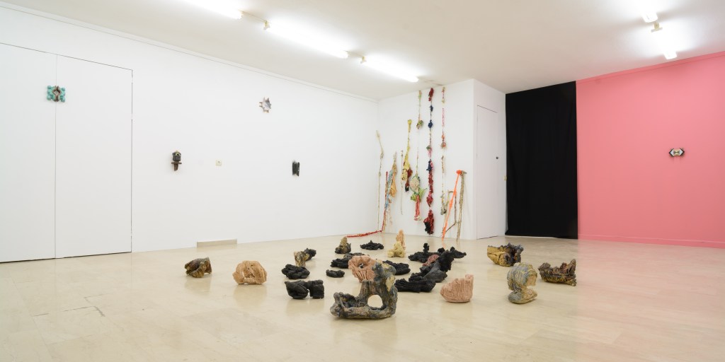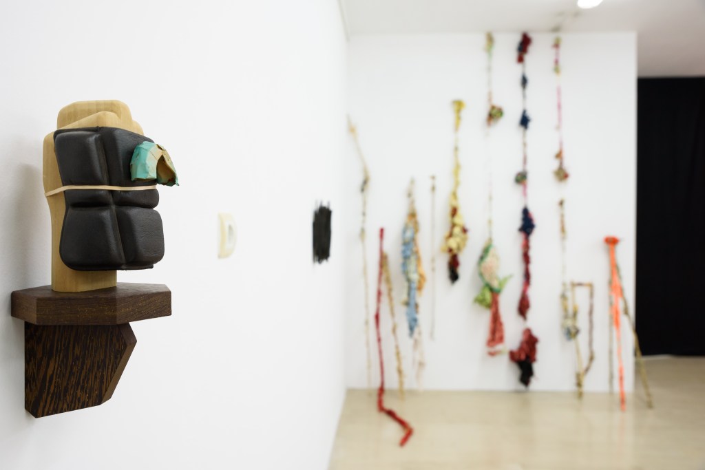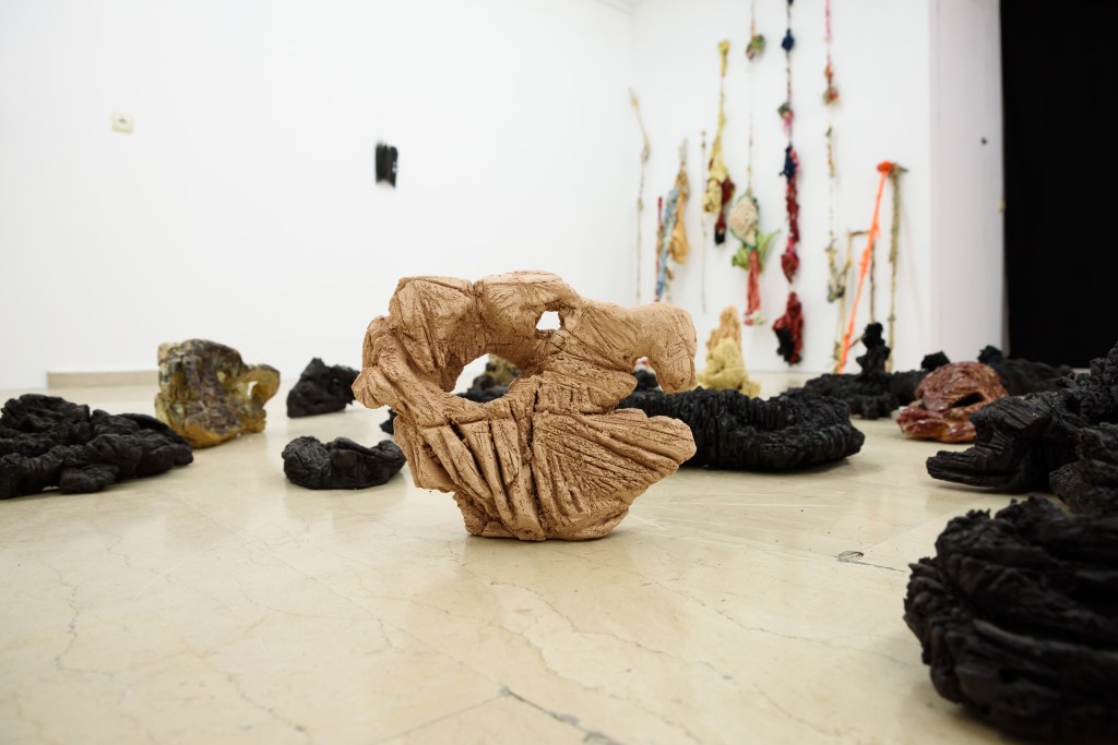 Ameladiotis presents two installations for this exhibition. ‘A primary design study on incomplete stones’ explores his preoccupation with the art of ceramics, which concisely embodies the concept of the organic and gradual process of material manipulation without anticipating the artworks evolution and the final form. Archetypically, the raw material of ceramics originates from sand, which according to beliefs, is the main component of life. In dialogue with this cluster of ceramics is a series of sticks and knots, ‘Blinds of confession’. This piece is the result of endless, stereotypical and obsessive acts which develop imperfectly via touch postponing their completion in uncertain time and length. The term “blinds’ in the title refers to the thin shutters of the narrow confessional rooms in the Catholic Church, as the process of knots takes in account the units of measurement of prayer and repentance in the Orthodox Church.