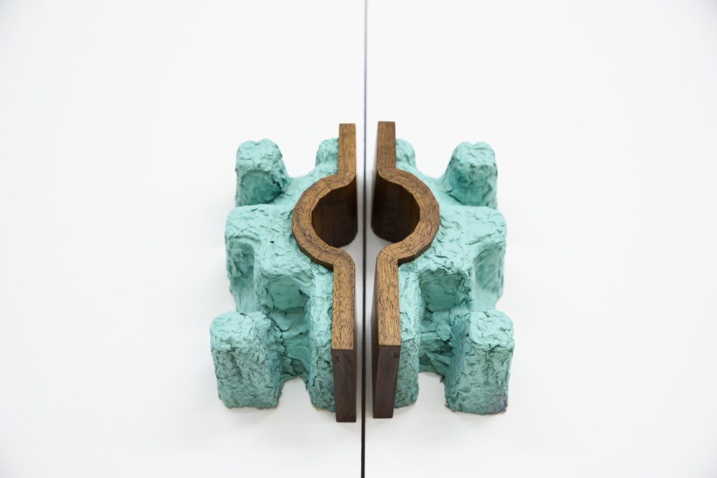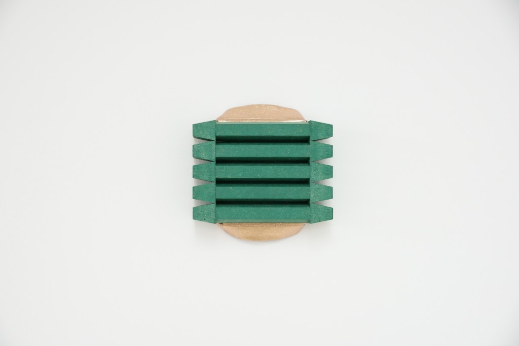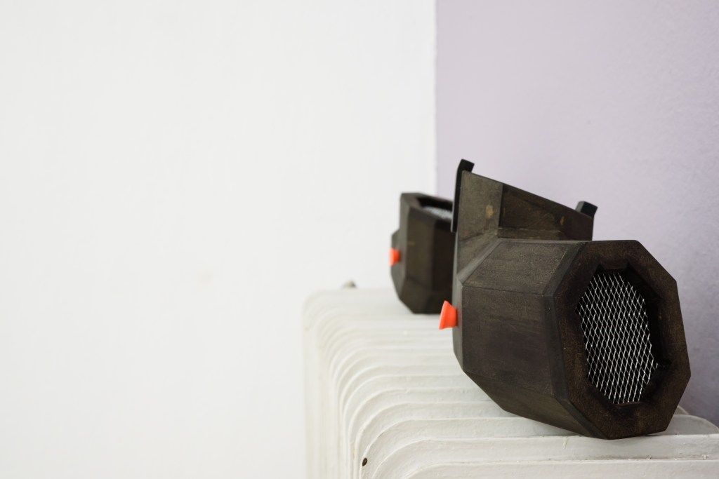 Kipps’ series of wall sculptures act as a symbol of sorts or a warning marker. These pieces stem from a curiosity about the design of symbols, visual communication and how we are encouraged to interpret and perceive the objects that make up our surrounding environments. However, unlike traditional symbols which are often designed to associate with a linear meaning or message, his work explores combinations of broad influences and source images to create hybrid sculptural objects. He is interested in the way people choose to model and customise their environments and surrounding commodities, particularly objects associated with asserting or diffusing power, restricting behaviour and understanding social hierarchies. Each artwork in the exhibition has been carefully positioned to function and interact with the environment. Kipps’ recent sculptures are all named after bands from niche music genres of Metal such as Doom, Sludge, Thrash and Crust Punk, charging each object with a new atmosphere and an additional layer of symbolism.