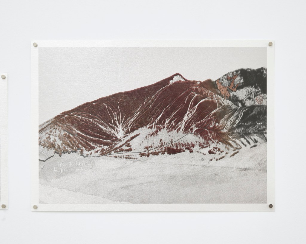 At a time where it is common to be largely disconnected from the landscape and natural world, the works in this exhibition propose readings of individual experiences and behaviour through the natural. Maipa explores the poetic dialogue between body and landscape through semi fictional compositions that layer inner landscapes, symbols and allegories; synthesis of language and image that seek to create open-ended narratives. In her collages, Mountains, where close up details of damaged skin form the ridges of photographed mountains, there is a sharp contrast between the bodily vulnerability and the hardness of mountains. Mountains have often acted as borders, or impasses across which people have long traversed. Through this physical experience, the body is assimilated into the landscape. By photographically targeting the body and its wounds, emphasis is given to the anxiety of a new journey or exploration. They also act as key influencing factors in evolution. When a species population is split by a border the magnitude of a mountain range, a divergence can, over time, occur. In Jones’ photographic studies of botanically evolved defences, evolution is a central theme, presenting multiple adaptations with similar effects. To view these as analogous to our own behaviours has the potential to raise questions about passive aggressive behaviours on both individual and collective levels.