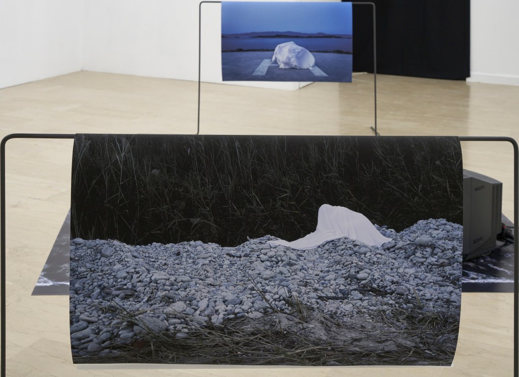 Maipa’s installation Swallow Everything In Brief suggests a sensory experience of the environment; by covering the body with a fabric she experiments with another way of integrating the body and landscape. Through this process, the subject, object and environment are being transformed into a new dialogue questioning presence, absence and the inevitable cycles in nature and life; a recognition of the human form as somehow a component of landscape, vulnerable and transient which passes through space. This dialogue can also be seen in Jones’ work View Towards the Pacific. This work documents a rock formation that’s uncanny likeness to a human form has a sculptural presence akin to a monument or memorial designed to continue someone’s life as memory beyond death. It addresses how we render and recognise ourselves in nature and other materials, and deal with our impermanence; the work suggests two different scales of time: the geological and that of a human lifespan. In contrast, Jones’ installation A Common Prick of Conscience, comprises enlarged images of prickles from roses and brambles, all enlarged by the same magnification factor so as to become a comparative group. They underline the emotionless character of evolution with regard to passive aggressive adaptations and the absence of compassion in nature. As stark black on white images, they become symbols whose meaning is derived from their evolutionary function. Lastly the group of works Fog present indeterminate surfaces, simply documenting an interaction of light, paper, movement and chemistry; they ambiguously suggest something atmospheric, whilst simply representing their creational process.